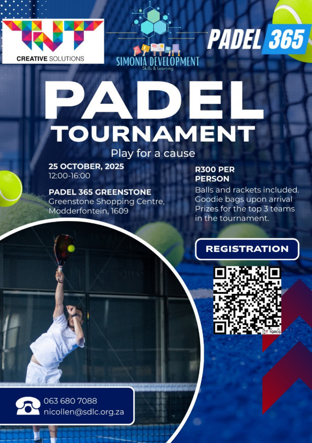 SDLC is partnering up with TNT Creative Solutions and Padel 365 (Greenstone) to host a fundraising Padel tournament! For only R300 per person, enter in the tournament to support SDLC's mission to empower women and children through our unique in-a-box initiative. The tournament will be on the 25th of October, 2025 at the Padel 365 courts in Greenstone Shopping Centre (Modderfontein, Gauteng) from 12:00-16:00. Enter as a pair and stand a chance to win some cool prizes!